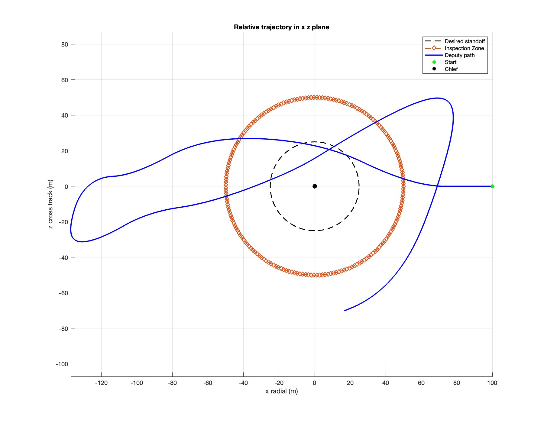 Relative trajectory in x-z plane (Deputy path with inspection zone)